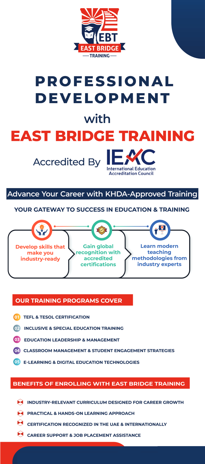 East Bridge Training (EBT) is a trusted choice for professionals seeking high-quality training programs that drive career growth. Our KHDA-accredited courses ensure learners gain industry-recognized certifications that enhance their employability and professional standing.